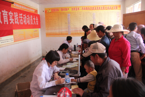 上午10点30分左右,三个组顺利到达了各自的义诊点。义诊现场早已排满了候诊的村民。他们期待着省级医院的专家上门服务,人群中有拄着拐杖的白发老人,有怀抱孩子的妇女,有行动不便被人搀扶的患者。看到村民如此渴求,医疗队队员们顾不上3个小时的舟车劳顿,立即投入义诊工作,测血压、问病情、做检查、开药方,热情周到地接待每一位群众,尽心竭力地为他们解难答疑、诊治病痛。中午时分,烈阳高照,前来咨询看病的村民依然络绎不绝,参加义诊的各位专家顾不上吃饭,心里只想着在短暂的时间里多诊治几个病人,多帮扶几个家庭。一个大饼,一瓶水,就成为大家的午餐。义诊活动一直持续到下午3点,现场还不断有村民前来咨询、就诊,义诊不得不比原计划时间延长了半个小时。很多村民热切期盼医疗队能够经常来,当车已经开动时,他们还久久不愿离去。