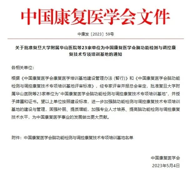 5月4日,根据《中国康复医学会康复医学培训基地建设管理办法(暂行)》和《中国康复医学会脑功能检测与调控康复技术专项培训基地评审标准》,经专家评审并报中国康复医学会审定,省康复中心(医院)获批为“中国康复医学会脑功能检测与调控康复技术专项培训基地”,成为全国获批该基地的23家医院之一,也是甘肃省唯一一家获此基地资格的医院。中心(医院)将以此为契机,进一步加强脑功能检测与调控康复技术专项培训基地的建设与管理,固强补弱、开拓创新,加强人才培训,鼓励科研创新,推广脑功能检测与调控康复技术,推动神经康复领域脑功能检测与调控技术发展,更好地辐射带动全省乃至西北地区神经康复医学事业发展。