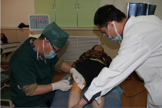 医院疼痛科医护人员正在为患者实施针刀治疗